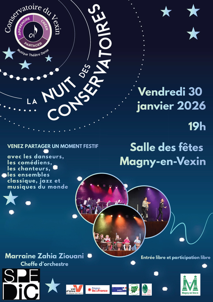 Le Conservatoire du Vexin a le plaisir de vous inviter à la Nuit des Conservatoires, qui se tiendra le vendredi 30 janvier 2026 à 19h, à la Salle des fêtes de Magny-en-Vexin.