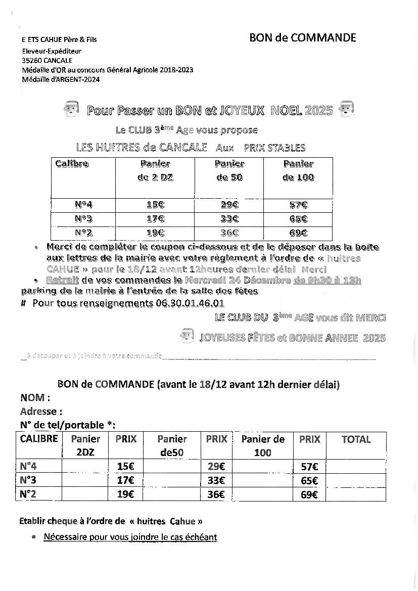 🎄🦪 Comme chaque année depuis plus de 15 ans, le Club du 3e Âge de Grisy vous propose la fraîcheur et la qualité des huîtres Cahue de Cancale !