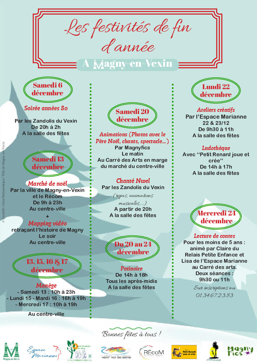 Ne manquez pas les RDV festifs du mois de décembre, organisés par la ville et les associations, tels que marché de Noël, chants, manège, patinoire, ateliers créatifs, lectures, …
