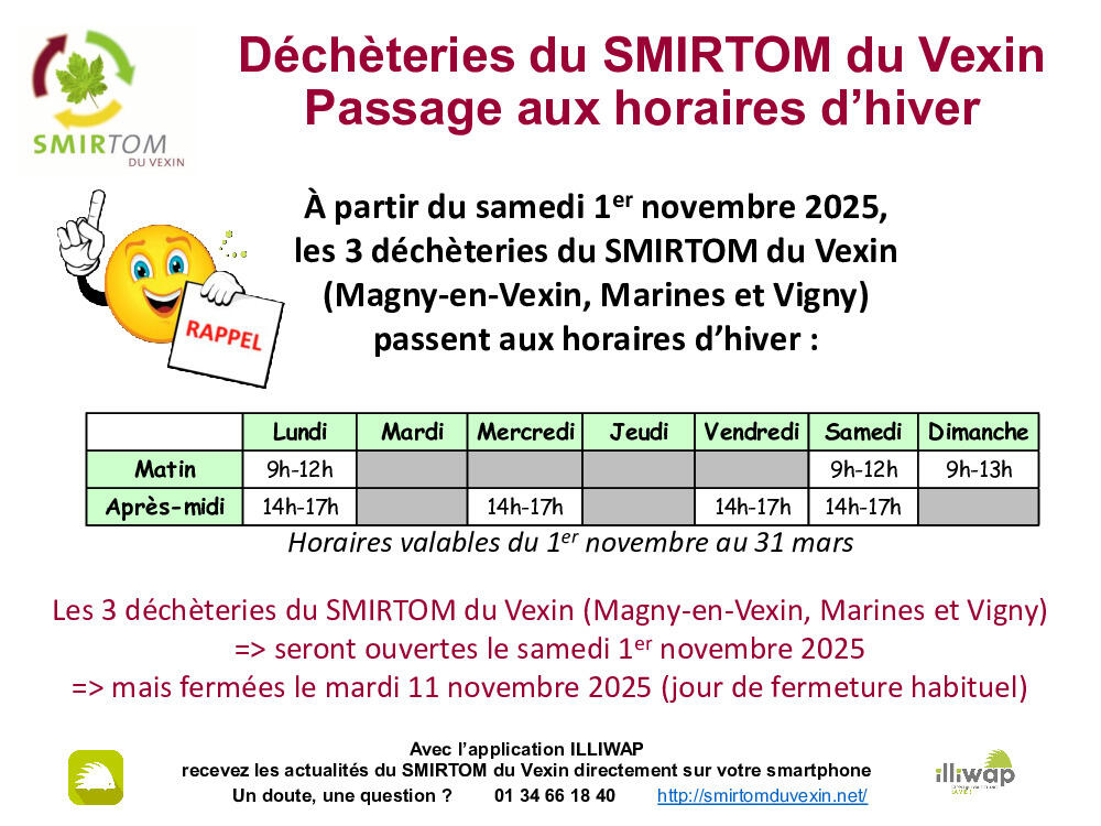 SMIRTOM DU VEXIN: DECHETERIES aux horaires d'hiver