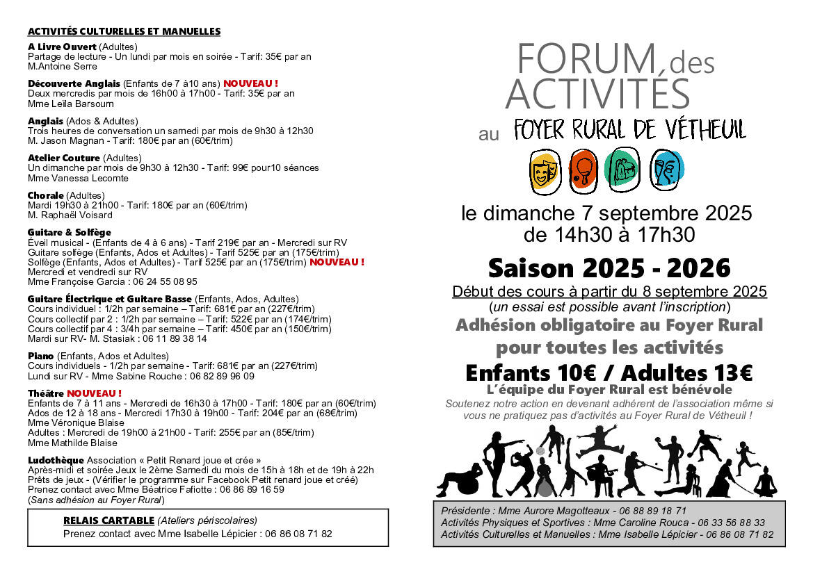 Foyer rural - Forum des activités 8/28/25 Rendez-vous le dimanche 7 septembre 2024 de 14h30 à 17h30 au Foyer Rural de Vétheuil