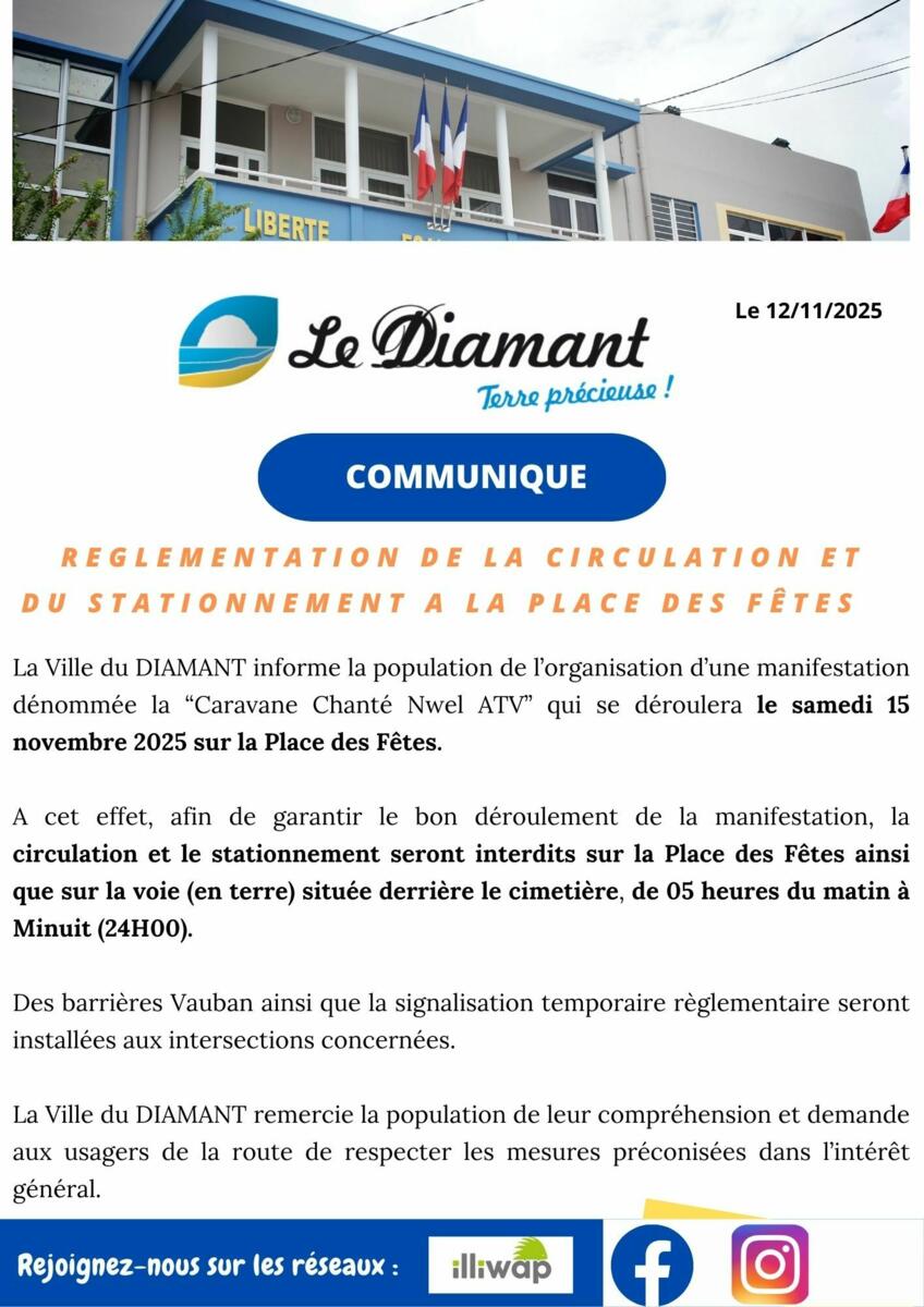 Dans le cadre de la manifestation dénommée "La Caravane Chanté Nwel ATV" prévue le samedi 15 novembre 2025 sur la Place des Fêtes, la Ville du Diamant informe la population de l'interdiction de la circulation et du stationnement sur la Place des Fêtes et sur le chemin en terre situé derrière le cimetière