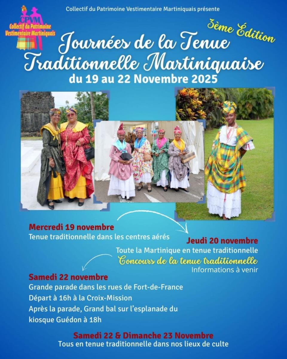 📣Dans le cadre de la 3ème édition des Journées de la Tenue Traditionnelle Martiniquaise, le Collectif du Patrimoine Vestimentaire nous convient à honorer, valoriser notre héritage vestimentaire et culturel, 𝗱𝘂 𝗺𝗲𝗿𝗰𝗿𝗲𝗱𝗶 𝟭𝟵 𝗮𝘂 𝗱𝗶𝗺𝗮𝗻𝗰𝗵𝗲 𝟮𝟯 𝗻𝗼𝘃𝗲𝗺𝗯𝗿𝗲.