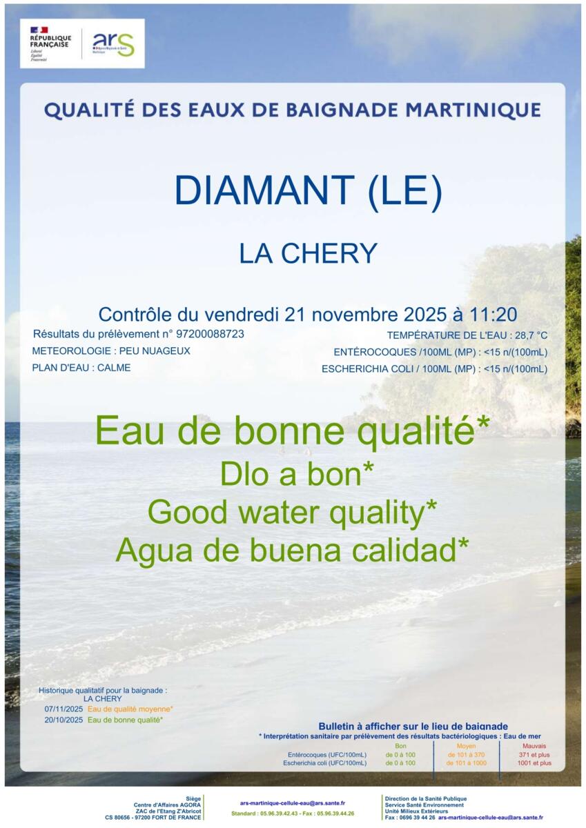 ๐Retrouvez les rรฉsultats de la qualitรฉ des eaux de baignade des plages du Diamant fournis par l'Agence rรฉgionale de Santรฉ de la Martinique (ARS).