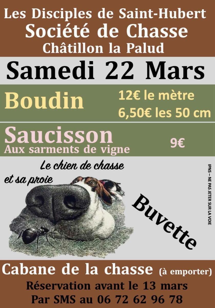 La Société de Chasse de Châtillon-la-Palud vous propose son délicieux boudin et son saucisson aux sarments de vigne à emporter !