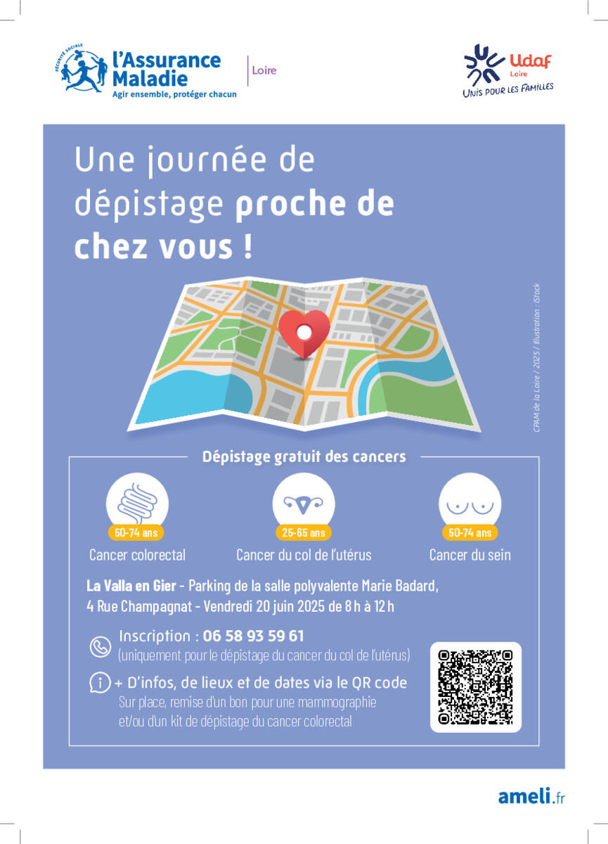 Dépistage gratuit des cancers 5/26/25 A vos agendas, le vendredi 20/06 de 8h à 12h, parking de la salle Marie BADARD.