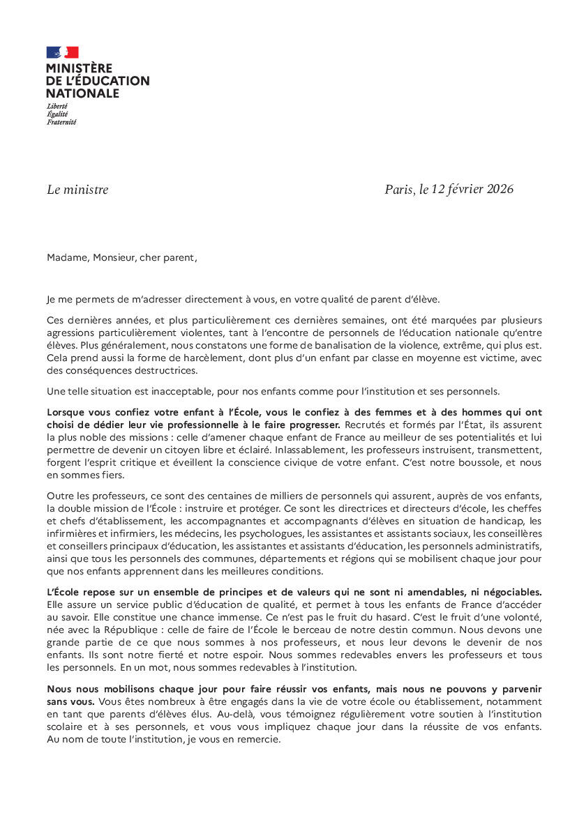 Vous trouverez en pièce jointe la lettre du ministre, rappelant à chacun d’entre nous les rôles à jouer auprès des enfants afin que l’École reste un lieu de sécurité physique, émotionnelle, psychique et affective.