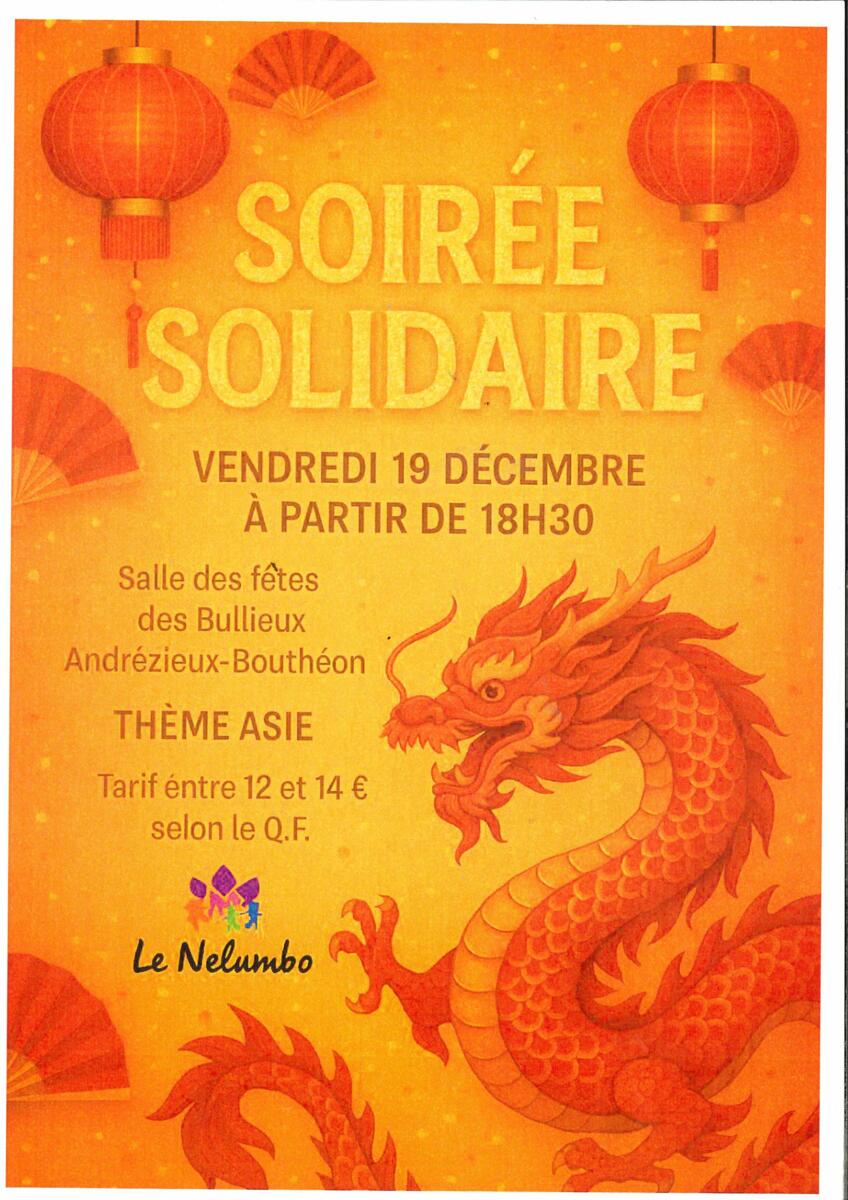 Vendredi 19 décembre dès 18 h 30, le Nelumbo vous donne rendez-vous à la salle des fêtes de Bullieux pour un réveillon solidaire sur le thème de l'Asie.