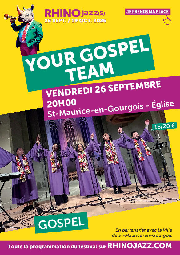 Cette année, RhinoJazz(s) organise un concert de Gospel le vendredi 26 septembre 2025 à 20h dans l'église de Saint-Maurice-en-Gourgois.