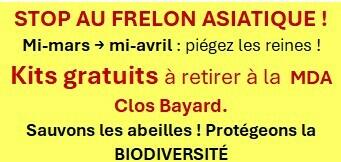 Stop Au Frelon Asiatique ! 26/02/2026 LUTTONS CONTRE LE FRELON ASIATIQUE ! Mi-mars → mi-avril : piégeons les reines avant qu’elles ne fondent leurs nids. Kits gratuits (avec notice) disponibles à la MDA – Clos Bayard. Protégeons nos abeilles et la biodiversité !