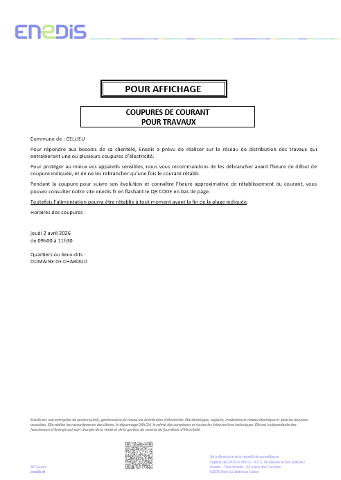 Coupure d'électricité pour travaux 3/30/26 Enedis vous informe d'une coupure d'électricité le jeudi 2 avril de 9h à 11h30 au domaine de Chaboud