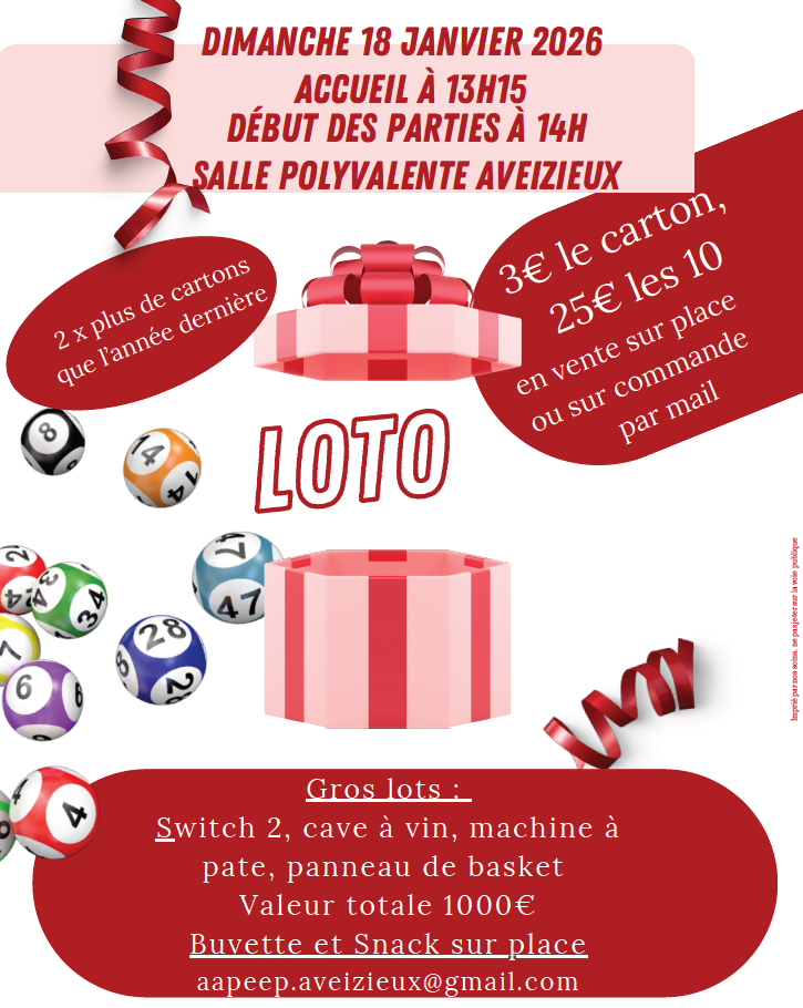 loto 18 janvier 2026 1/17/26 l'AAPEEP organise son traditionnel loto dimanche 18 janvier 2026 salle polyvalente Source : Mairie de Aveizieux