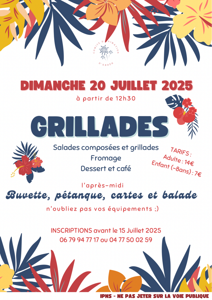 GRILLADES COMITE ANIMATION 6/28/25 LE comité d'Animation organise une journée grillade le dimanche 20 juillet à partir de 12h30.