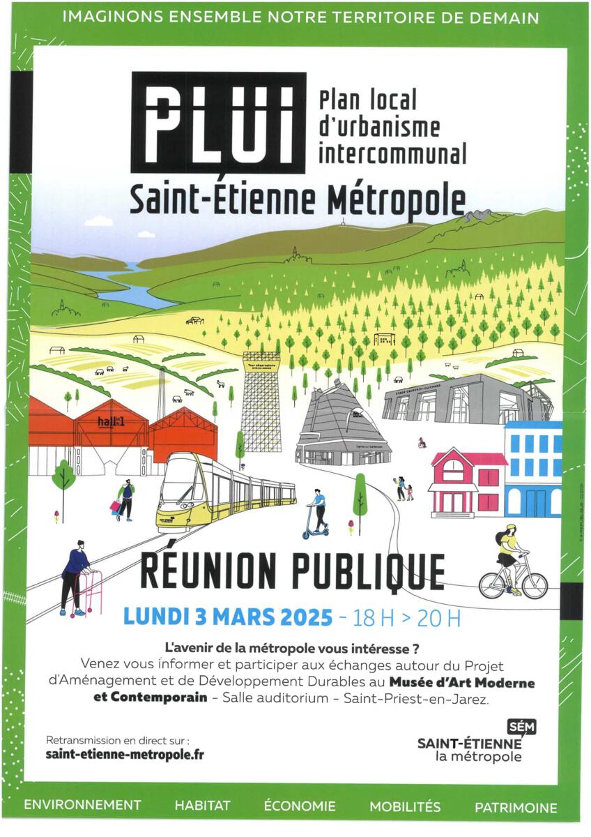 Une réunion publique sur le Projet de Plan Local d'Urbanisme Intercommunal se tiendra lundi 3 mars au Musée d'Art Moderne de Saint Etienne de 18h à 20h.