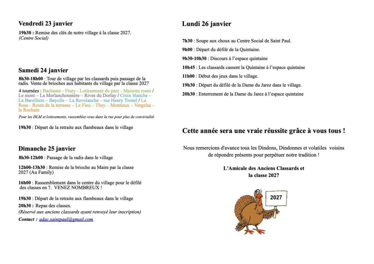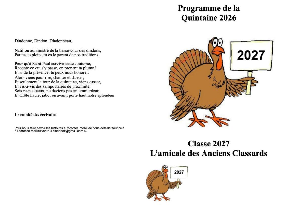 La Quintaine, fête patronale et traditionnelle emblématique de notre village, revient du vendredi 23 au lundi 26 janvier 2026. Elle sera accompagnée de la fête foraine, du 24 janvier au 1er février 2026. Les forains arriveront dès le 21 janvier pour s'installer.
