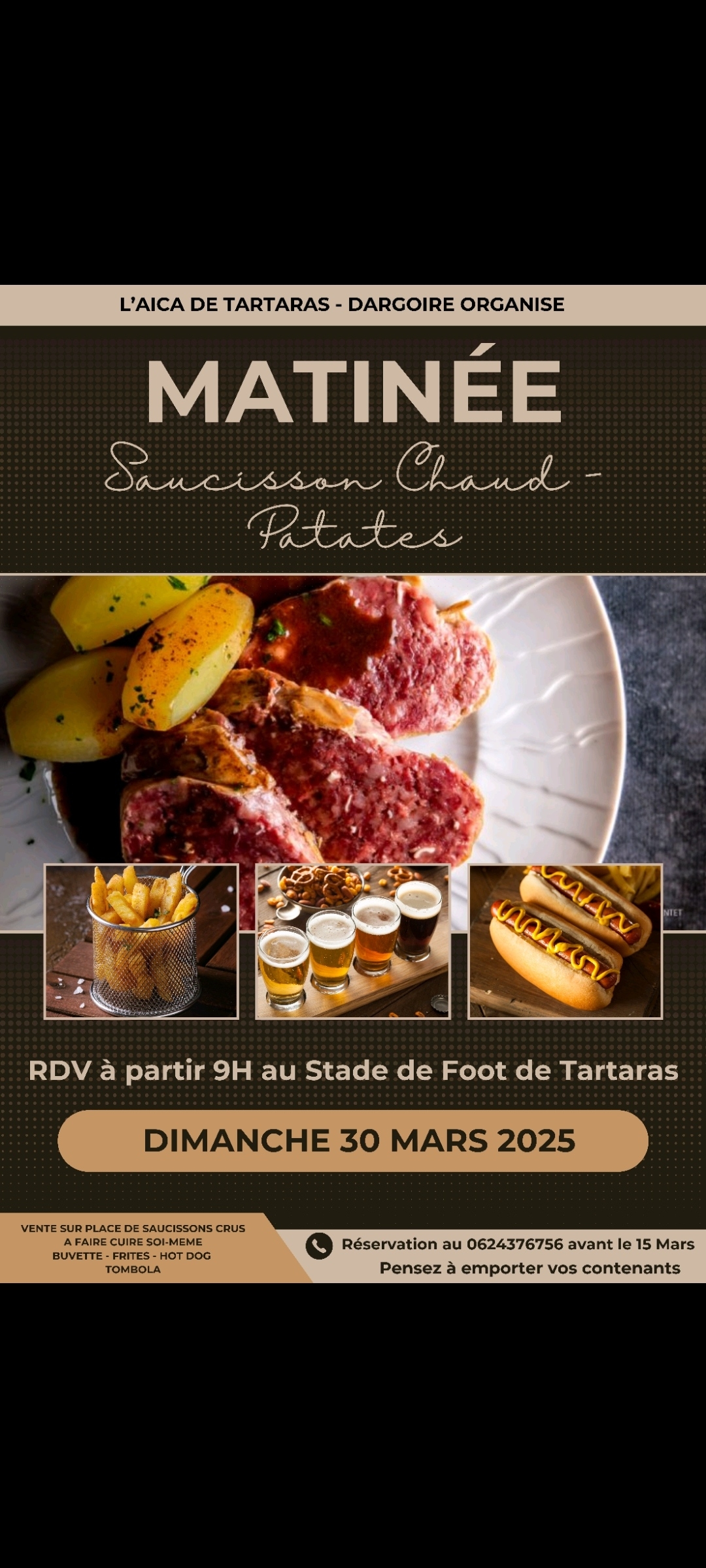 L'AICA TARTARAS/DARGOIRE vous attend nombreux lors de sa matinée saucisson / patates (8€ la part) au stade de foot de Tartaras.