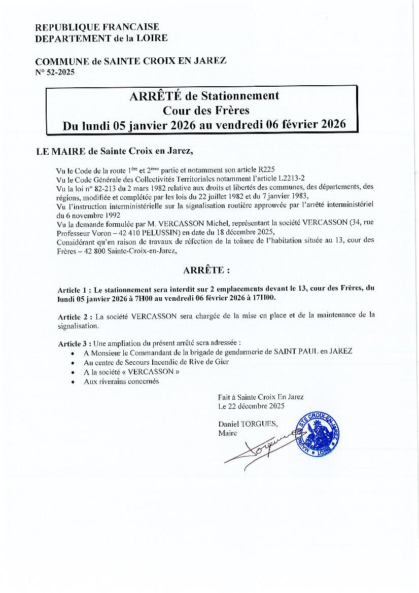 En raison de travaux de réfection de toiture , le stationnement sera interdit sur 2 emplacements devant le 13, cour des Frères, du lundi 05 janvier 2026 à 7H00 au vendredi 06 février 2026 à 17H00.