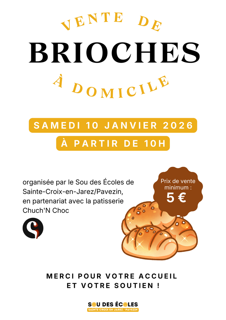 Le Sou des écoles organise sa traditionnelle vente de brioches à domicile sur les communes de Sainte-Croix-en-Jarez et Pavezin demain, samedi 10 janvier 2025, matin !