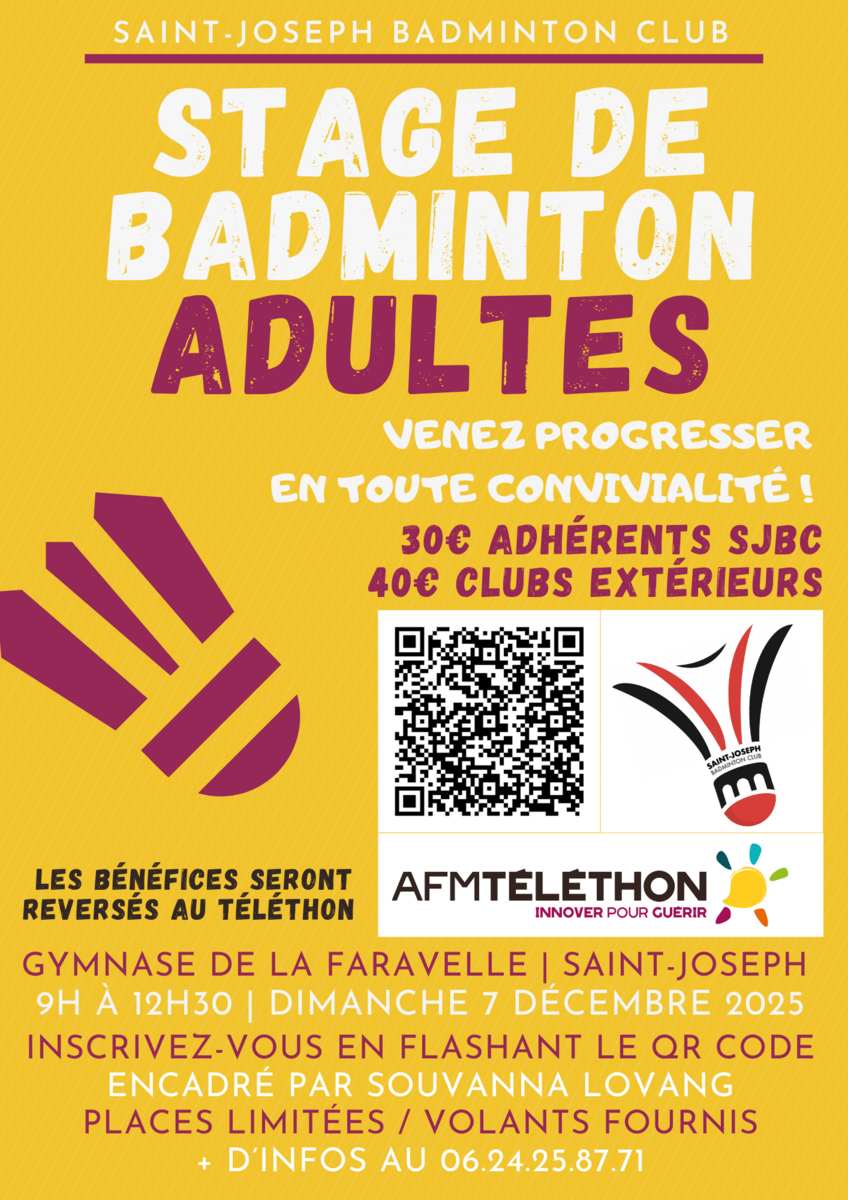 Vendredi 5 décembre dès 20h, viens t’éclater au gymnase de la Faravelle pour une soirée gratuite, fun et solidaire : badminton, pickleball, buvette et défis jusqu’au bout de la nuit ! Un mini-volant offert pour chaque don au Téléthon. Et pour les plus motivés, rendez-vous dimanche 7 décembre, de 9h à 12h30, matinée d’initiation et de perfectionnement au badminton (tous les bénéfices reversés à l’AFM Téléthon).
