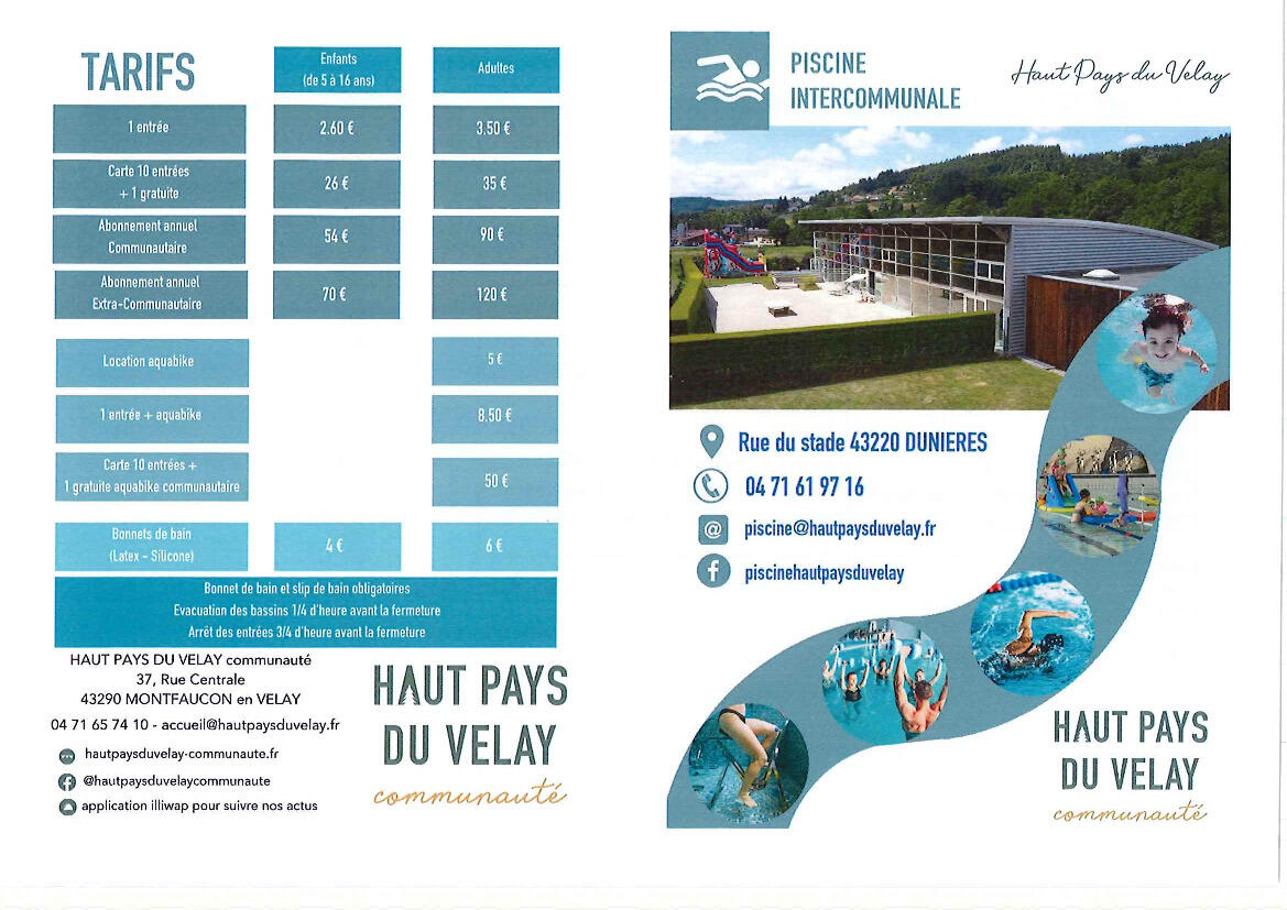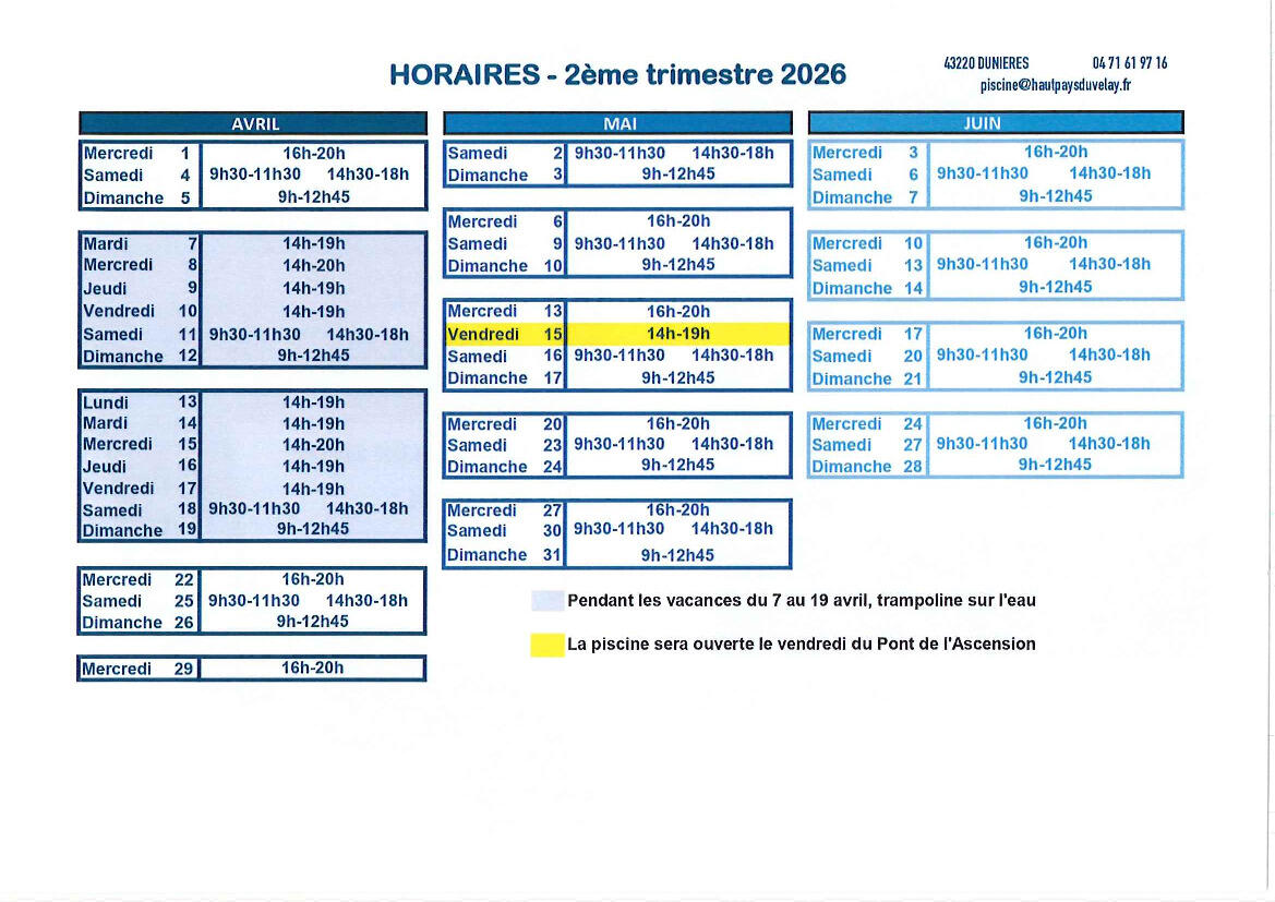 Horaires piscine 4/16/26 Veuillez trouver ci-joint les horaires d’ouverture de la piscine à Dunières pour avril-mai et juin 2026. Source : Mairie de Montregard