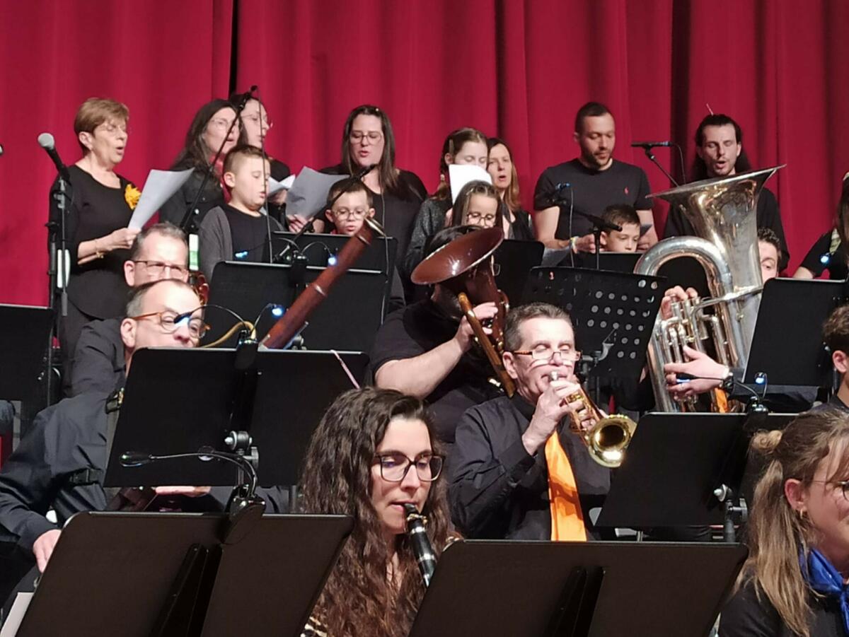 L'orchestre a ensuite pris place avec un chœur composés des élèves des formations musicales enfants et adultes. Sur un bel accompagnement musical, joué par notre Harmonie, les chanteurs ont interprété Siyahamba de Luigi di Ghisallo et Ameno d'Eric Levisalles.