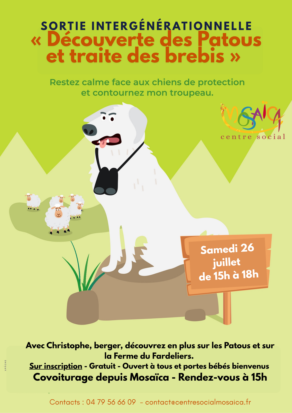 - Samedi 26 juillet 15h/18h : Découverte des Patous et traite des Brebis à la ferme du Fardeliers – Rdv 15h à MosaÏca, covoiturage – GRATUIT ET OUVERT A TOUS –
