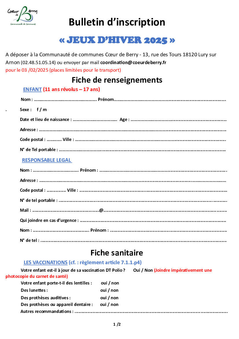 à déposer au siège de la Communauté de communes Coeur de Berry à Lury-sur-Arnon, ou bien par mail à : coordination@coeurdeberry.fr