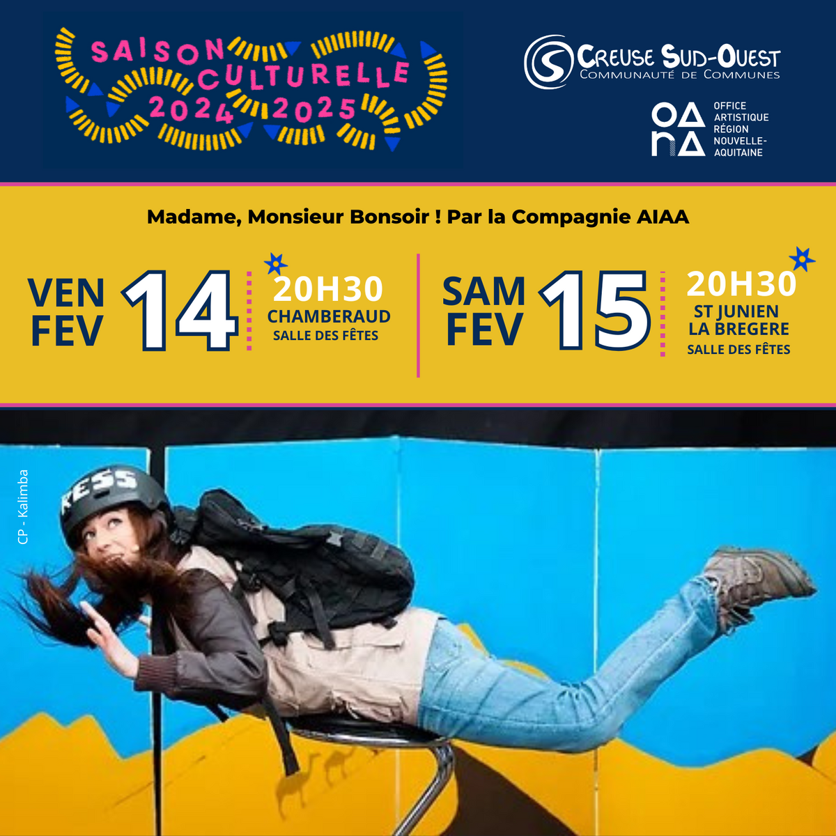 Rendez-vous le vendredi 14 fรฉvrier ร  20h30 ร  la salle des fรชtes de Chamberaud et le samedi 15 fรฉvrier ร  20h30 ร  la salle des fรชtes de Saint-Junien-la-Brรฉgรจre.