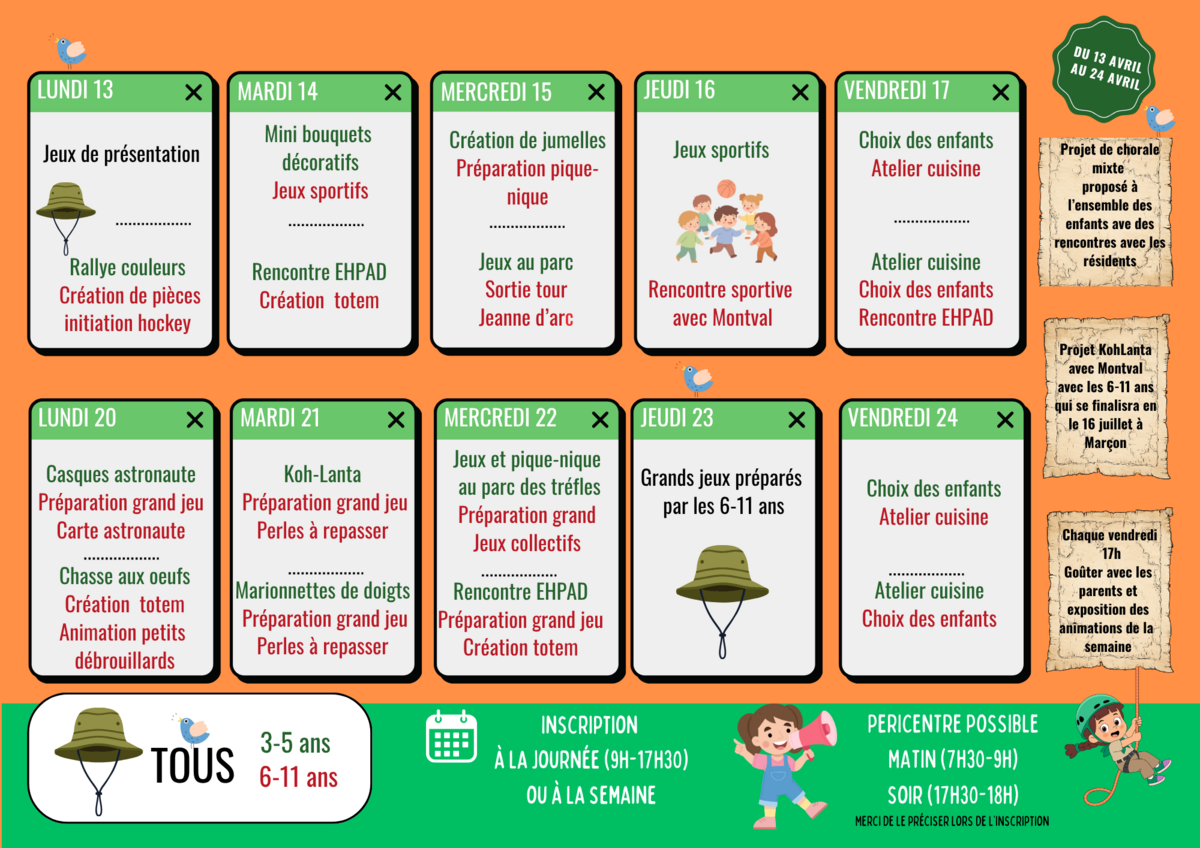 Programme des vacances de printemps 3-11 ans 4/21/26 Il reste des places !!! Pour inscrire vos enfants, veuillez nous contacter au 02 43 44 53 38 Source : Centre Social Val du Loir