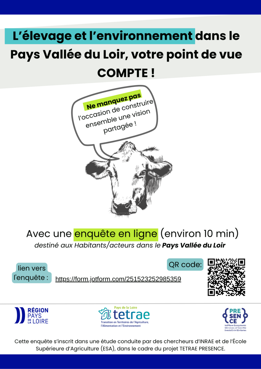 Dans le cadre du projet PRESENCE (INRAE & Région Pays de la Loire), voici un questionnaire pour recueillir votre perception sur la contribution de l'élevage bovin (lait et viande) à la qualité environnementale de notre territoire (eau, biodiversité, paysage).