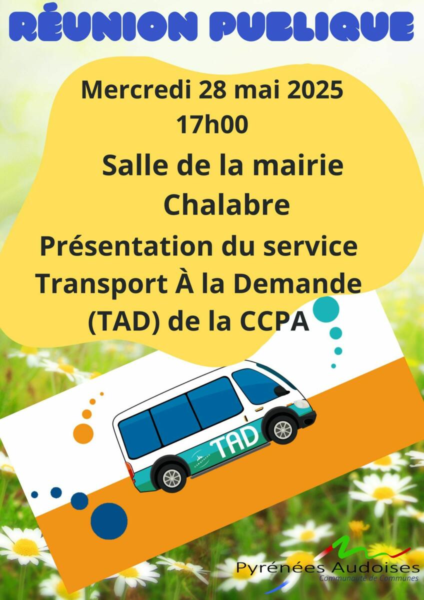 Mercredi 28 mai, Salle de la Mairie à Chalabre à 17h : présentation du service du transport à la demande proposé par la CC des Pyrénées Audoises.
