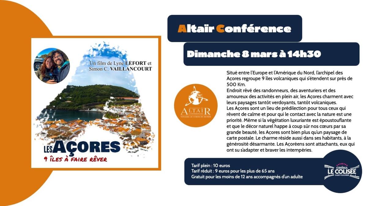 - Une conférence Altaïr Les Açores : 9 îles à faire rêver Le dimanche 08 mars à 14h30