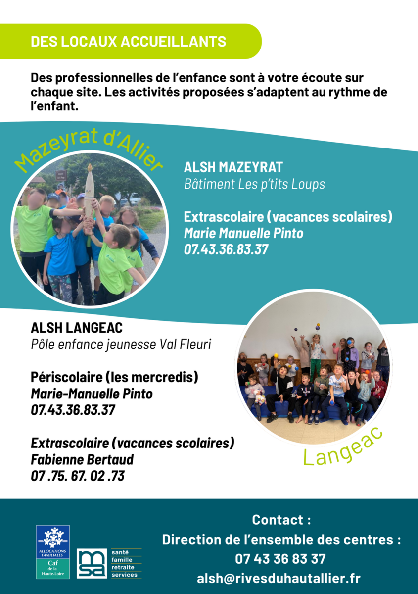 Retrouvez toutes les informations sur les centres sur le flyer ci-dessous ou sur notre site internet : https://www.rivesduhautallier.fr/alsh-vacances-scolaires