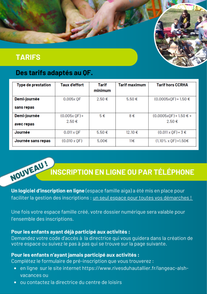 Inscription en ligne sur https://www.rivesduhautallier.fr/alsh-vacances-scolaires