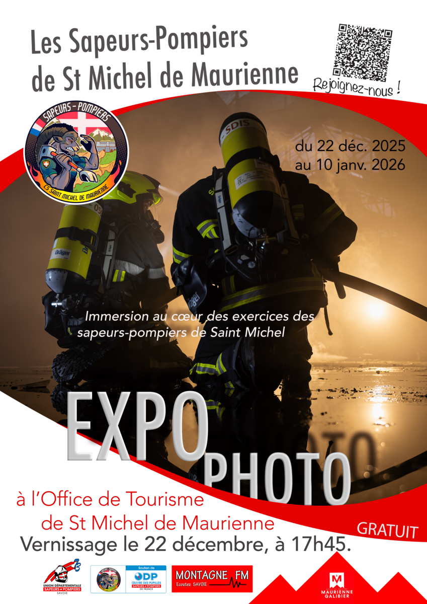 L’Amicale des sapeurs-pompiers de Saint-Michel-de-Maurienne organise sa première exposition photo , intitulée « Immersion au cœur des exercices des sapeurs-pompiers de Saint-Michel ». Vous pourrez y découvrir 20 tirages grand format (100 x 60 cm) , du 22 décembre 2025 au 10 janvier 2026 à l’Office de Tourisme de Saint-Michel.