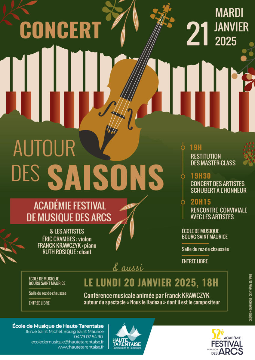 🎻🎹🎤 Trois artistes de l’Académie Festival de Musique des Arcs (Franck Krawczyck, Éric Crambes et Ruth Rosique), interviendront à l’École de musique de Haute Tarentaise du 20 au 22 janvier 2025.