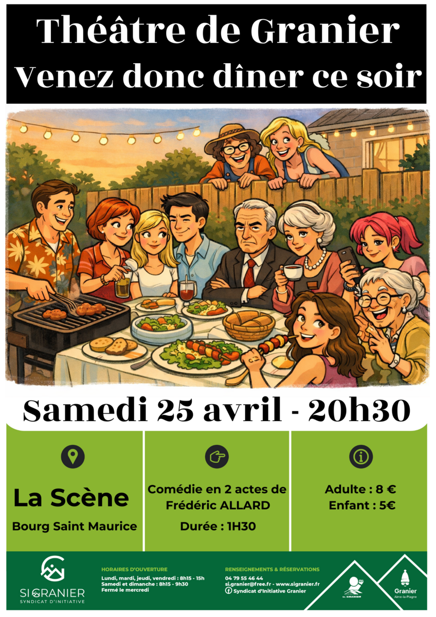Apr 25, 2026 8:30 PM - 10:20 PM "Venez donc dîner ce soir !" avec la troupe du Théâtre de Granier - à Bourg Saint Maurice View more
