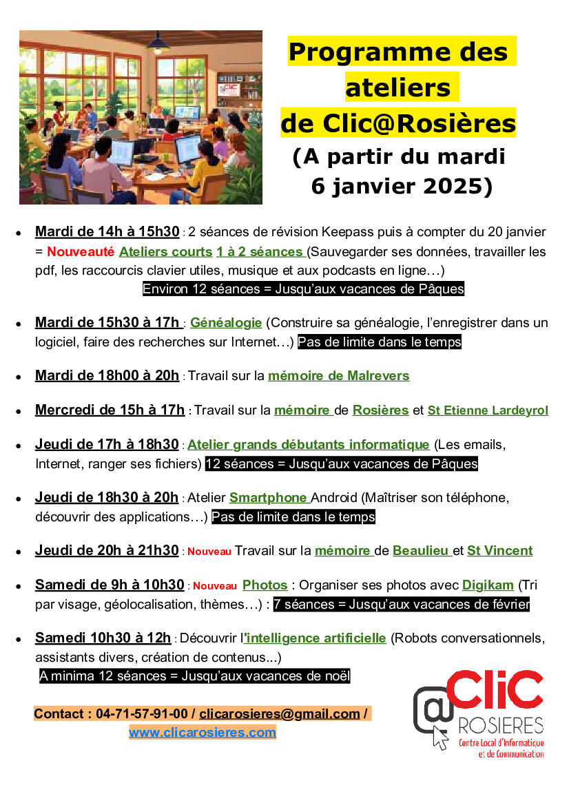 Programme des ateliers de Clic à compter du mardi 6 janvier