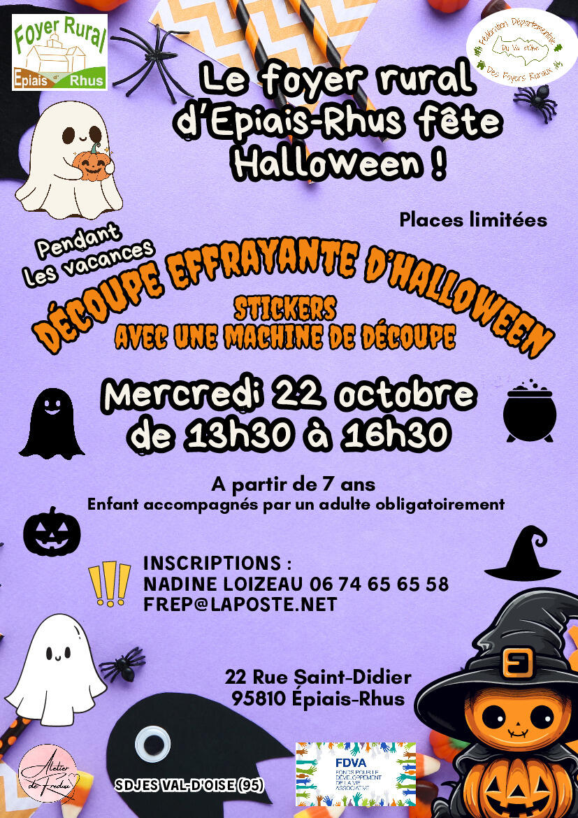 Atelier Halloween 22 octobre 2025-FR EPIAIS 10/14/25 Inscription par téléphone ou par mail. A partir de 7 ans Enfant accompagné par un adulte obligatoirement