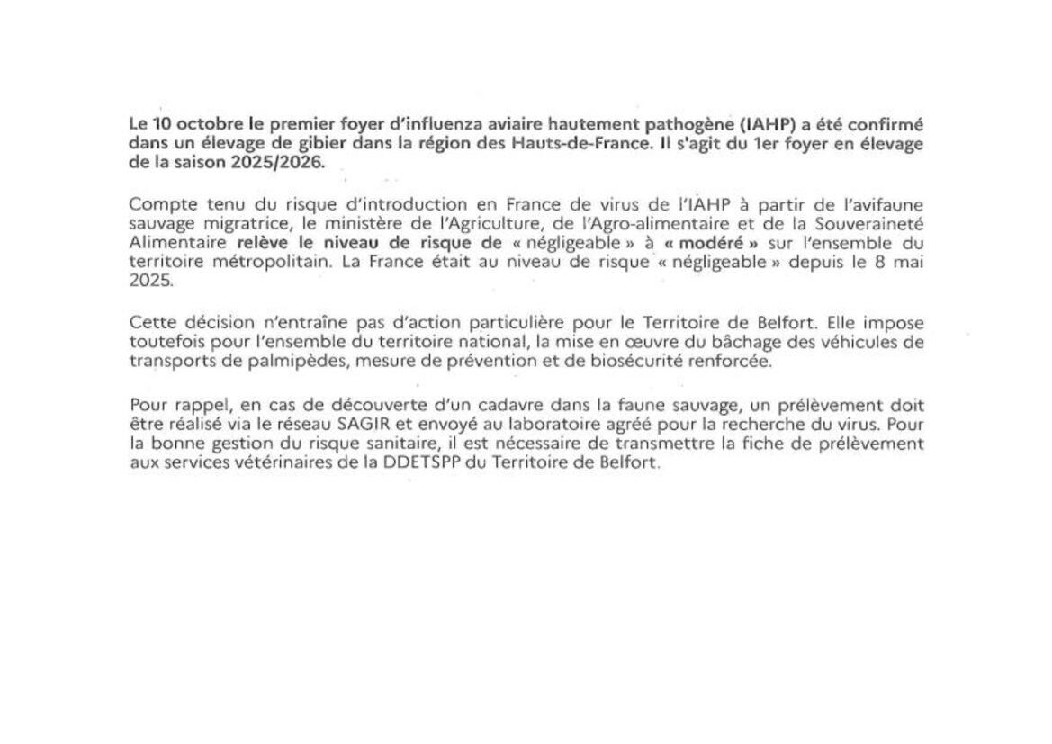 INFLUENZA AVIAIRE NIVEAU DE RISQUE ELEVE