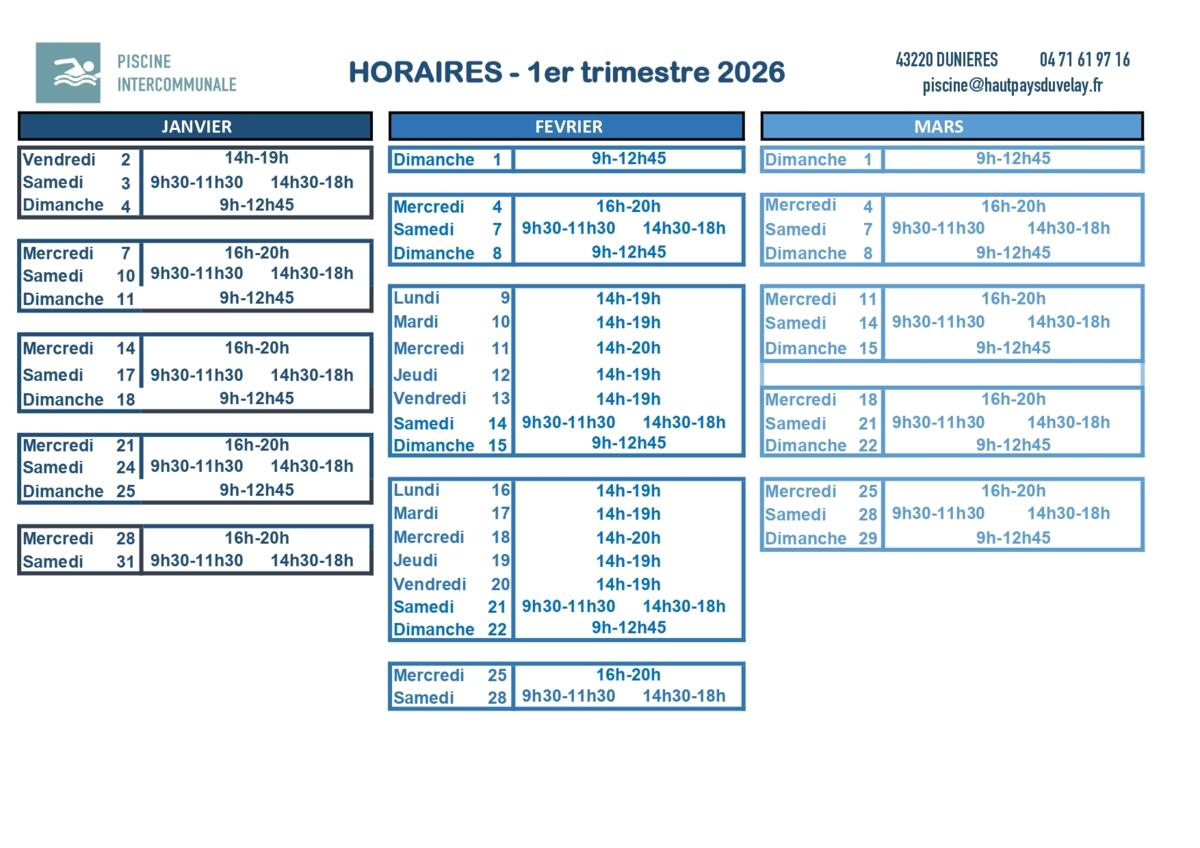 Retrouvez ci-dessous les informations sur les horaires d'ouverture au public de janvier à mars 2026 pour la piscine intercommunale à Dunières.