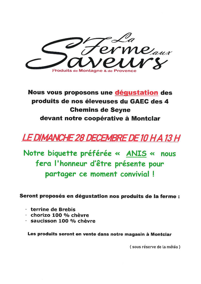 Dégustation à La Ferme Aux Saveurs 12/23/25 DÉGUSTATION DE PRODUITS à la ferme aux saveurs Dimanche 28 décembre de 10H à 13H