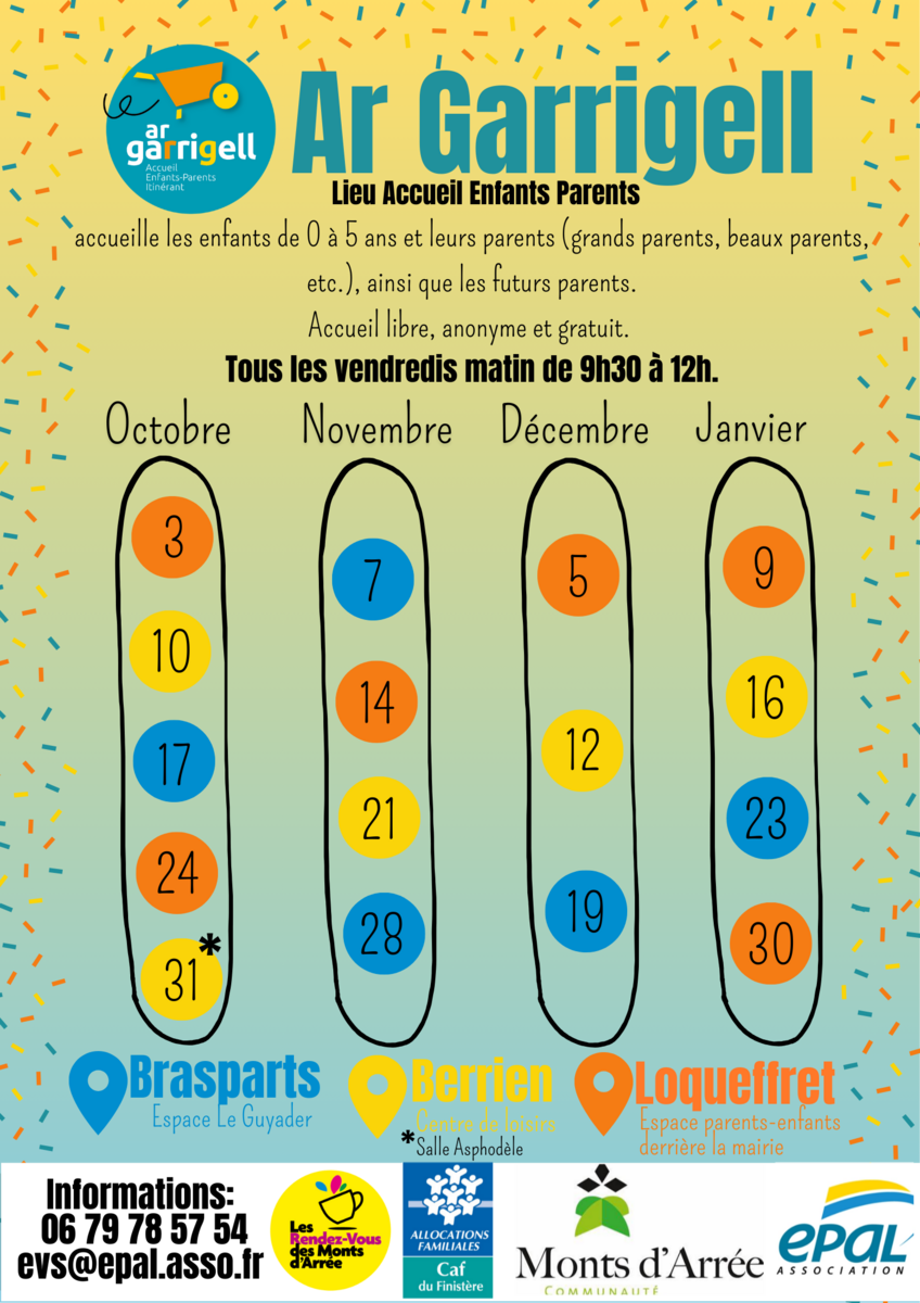 Le calendrier des accueils est disponible dans les différentes mairies des communes, via le compte Facebook « Rdv des Monts d’Arrée », par mail à evs@epal.asso.fr ou au 06.79.78.57.54.