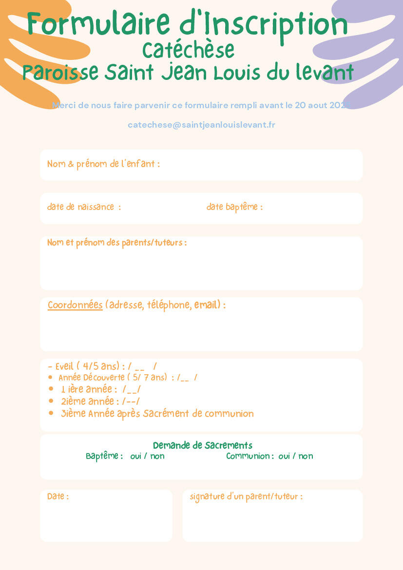 Vous pouvez utiliser le formulaire d'inscription ci joins et le renvoyer par mail à : catechese@saintjeanlouislevant.fr