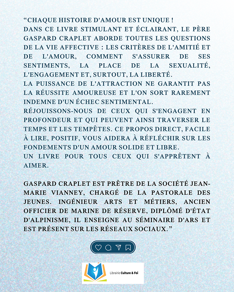 Le père Gaspard Craplet, prêtre « phénomène aux 100k followers » bien connu pour son franc parler en matière d'affectivité et de sexualité, viendra présenter son dernier livre LIBRES ! Pour aimer en vérité au collège lycée Saint-Pierre à Montrond, le lundi 10 novembre 2025 à 18h00. Un temps de questions/réponses sera proposé.