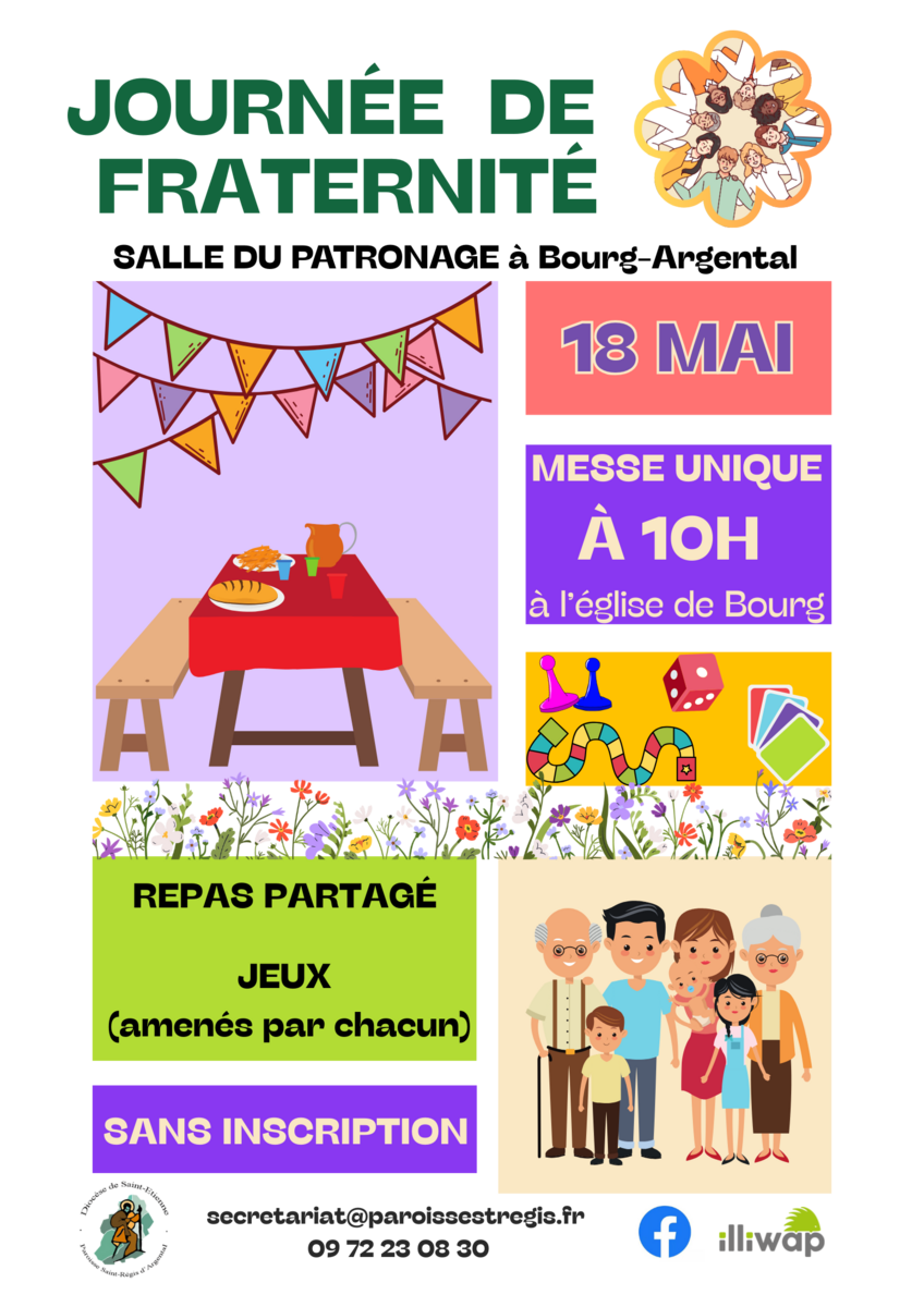 Fête paroissiale 5/9/25 JOURNÉE DE FRATERNITÉ Dimanche 18 mai Messe à 10 h à Bourg A partir de 12 h à la salle du patronage, journée d’amitié avec repas partagé et jeux (apportés par chacun). Sans inscription.