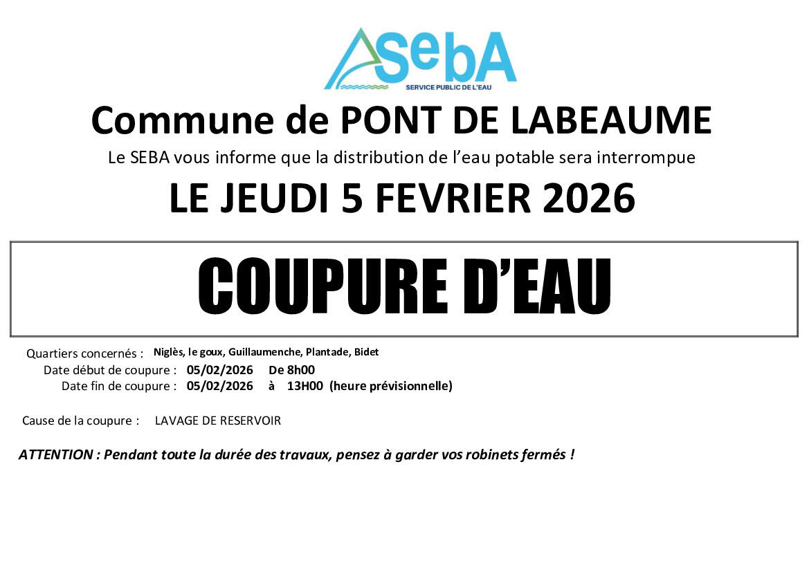 AVIS DE COUPURE D'EAU PONT DE LABEAUME 05/02/2026