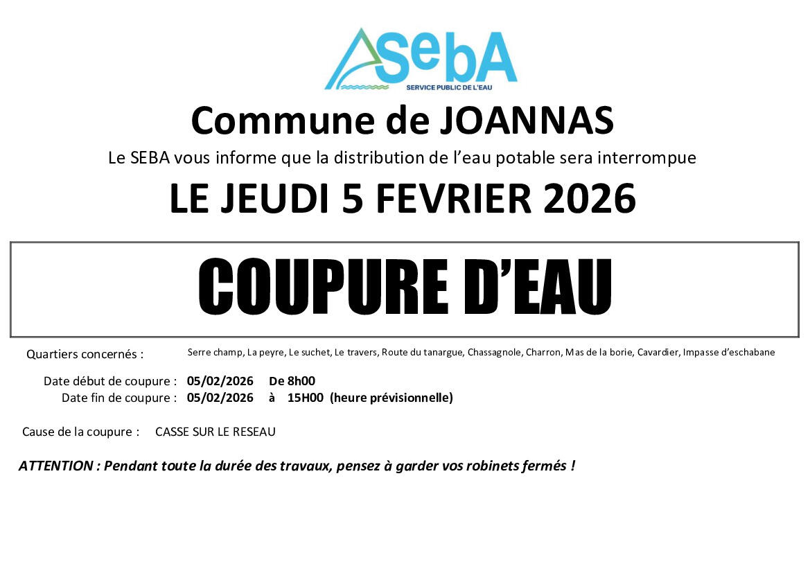 AVIS DE COUPURE D'EAU JOANNAS 05/02/2026