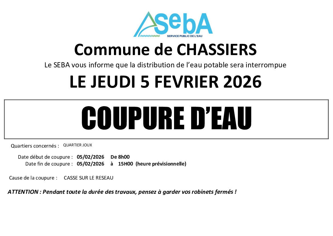 AVIS DE COUPURE D'EAU CHASSIERS 05/02/2026