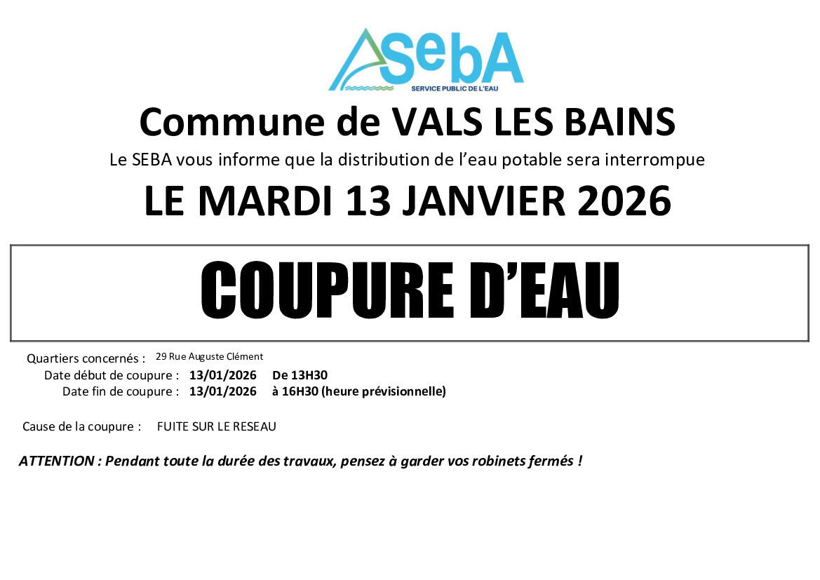 Home / News / AVIS DE COUPURE D'EAU VALS LES BAINS LE 13/01/2026